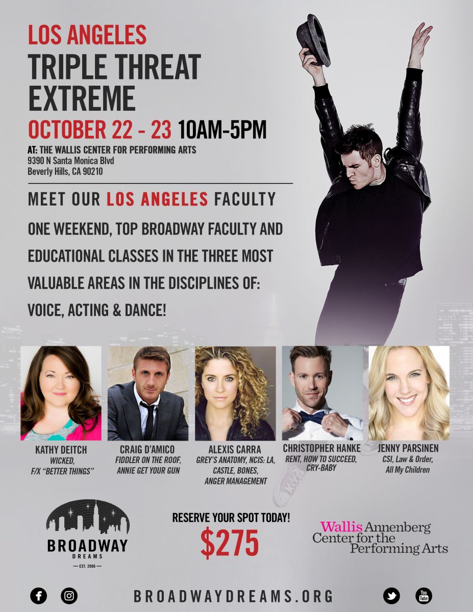 Triple Threat Extreme is a weekend immersive experience that sharpens skills and emphasizes core values learned through our Broadway Dreams Summer Intensive. The program emphasizes three central Broadway Dreams tenets: deliver lyrics and dialogue with organic truth; tell a powerful story with exceptional vocal quality; and master movement technique with grace and style. Guided by a team of elite educators, students take part in a series of demanding exercises that pushes their talents and abilities — illuminating the skills and stamina necessary to be a successful stage professional. This workshop is for participants ages 12 through adult.